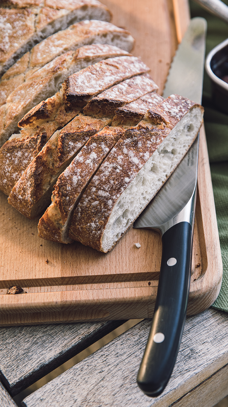 PS brödkniv är generöst tilltagen. Ordentlig tyngd och ett långt, tandat blad underlättar arbetet med, till exempel, ett levainbröd.