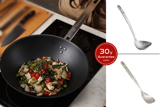 I wok-setet ingår det också hålsleven med det unika hålmönstret samt vår matlagningssked i rostfritt stål.